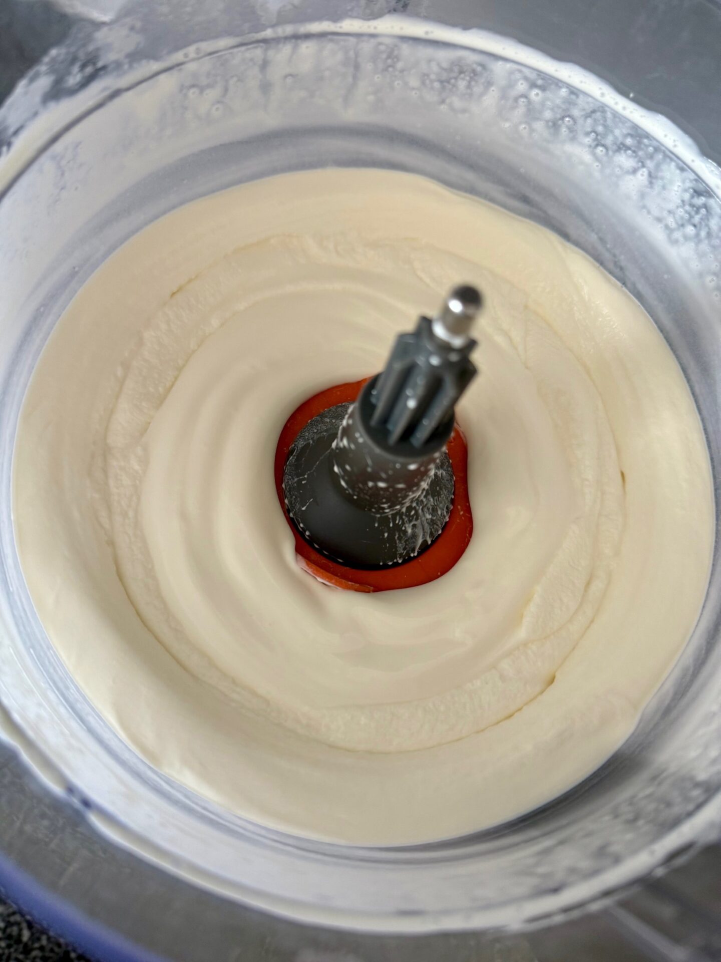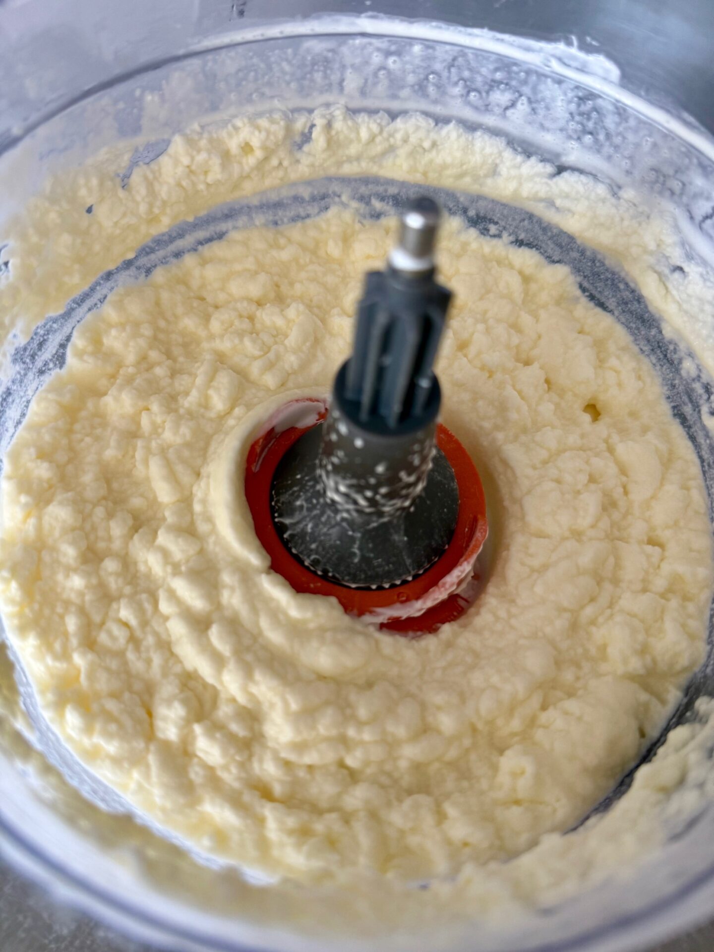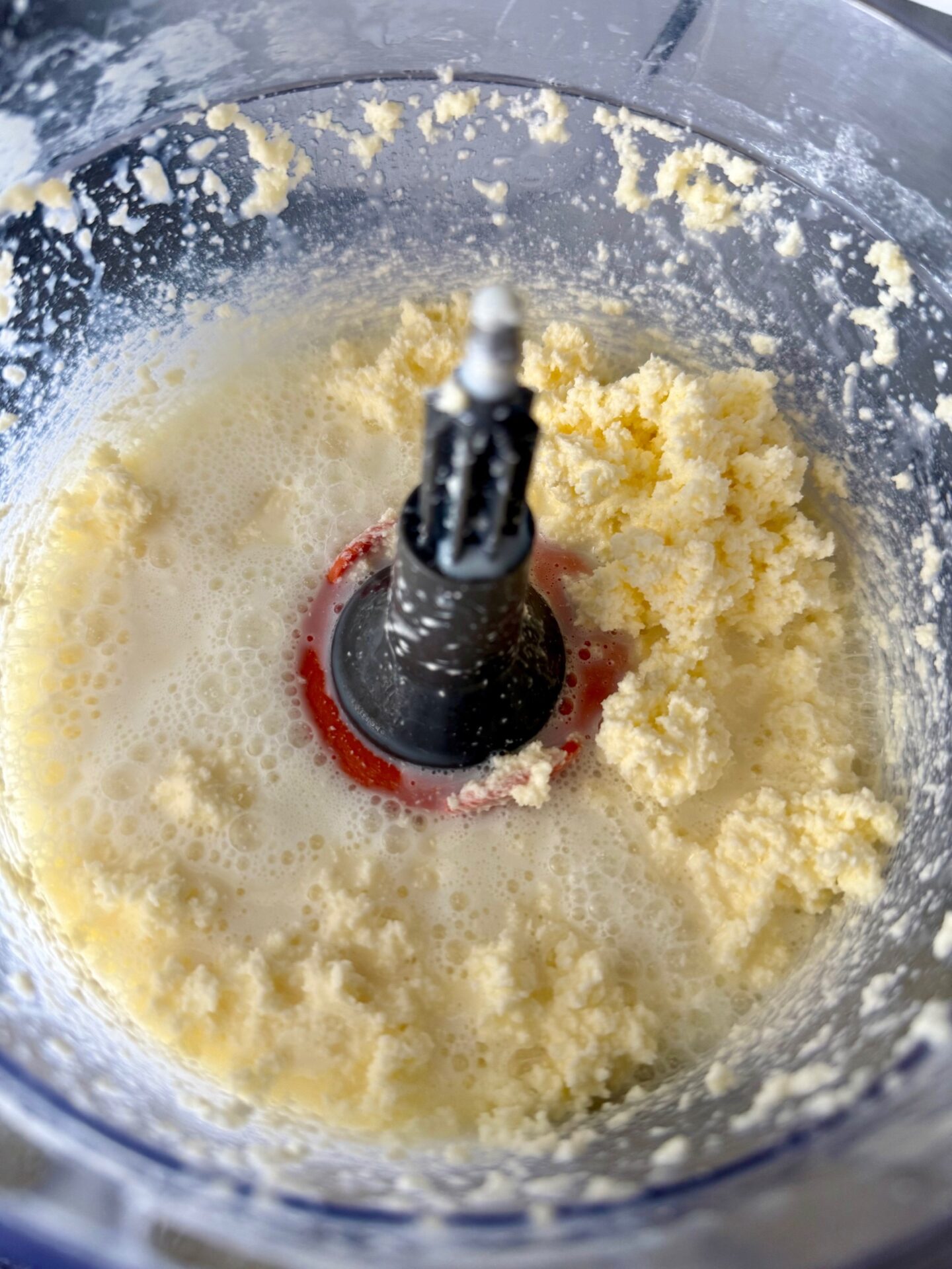 Put your heavy cream in your appliance/container of choice and start mixing at a high speed. I never measure, but I would recommend at least half a liter in order to get a good butter yield. Within a few minutes, it will turn to whipped cream. Continue letting it mix, making sure to scrape down the sides if needed, and it will start to thicken up and look similar to a paste. This means you are getting close! Finally, the solids and liquids will separate and you can turn it off when the separation is very apparent and chunky.