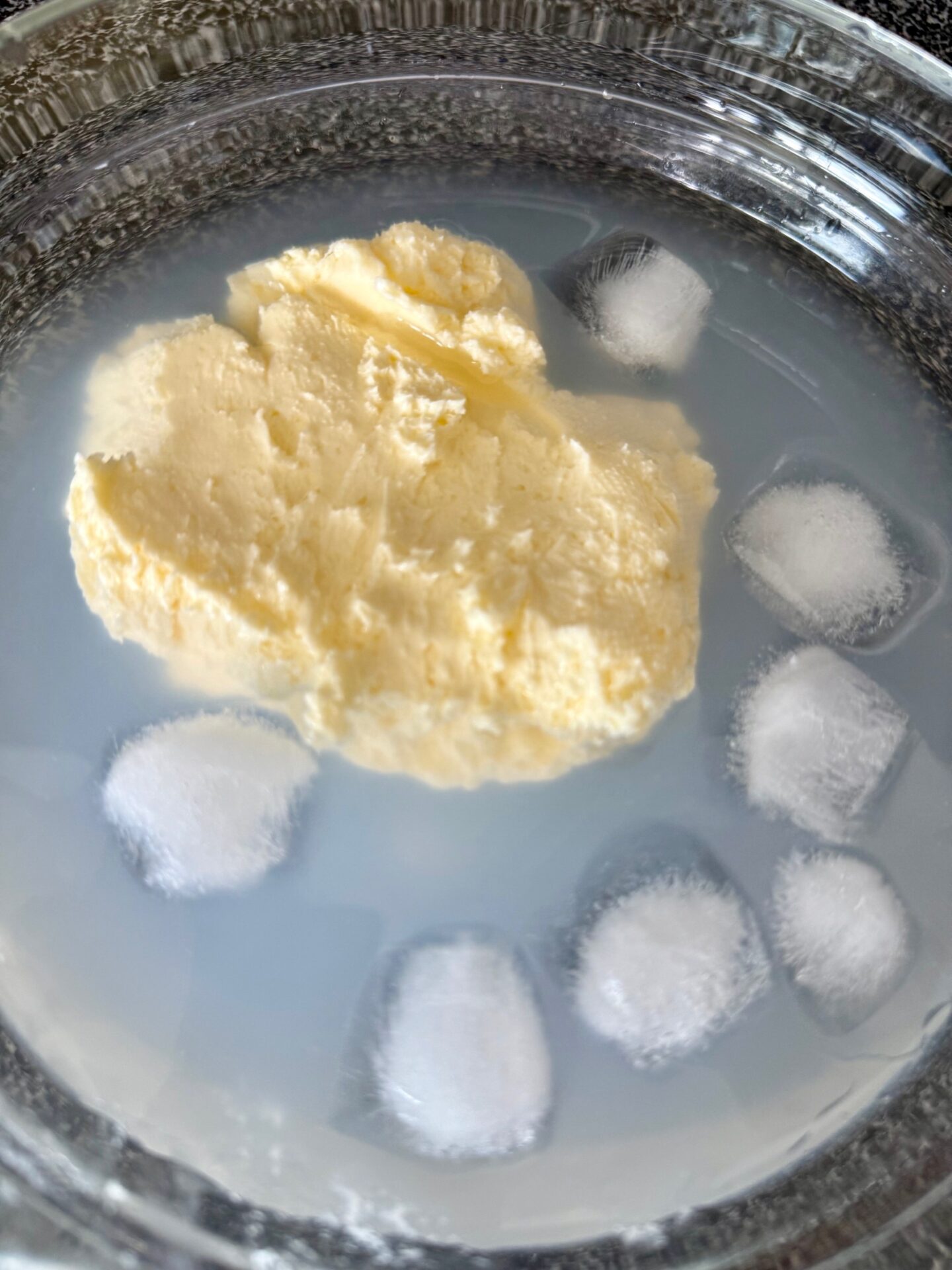 Strain the butter and squeeze out any excess liquid that you can with your hands, gloves optional. The liquid is buttermilk, so don’t throw it away! Save that liquid gold for another recipe. Place your butter in a bowl of ice water and fold the butter over itself, sort of like a gentle knead. The point here is to remove as much buttermilk as possible. The more you remove, the longer your butter will last. Switch out the water when it gets too cloudy and repeat until clear. The reason for the ice is to keep the butter mostly solid and easy to handle after being warmed up by your hands.